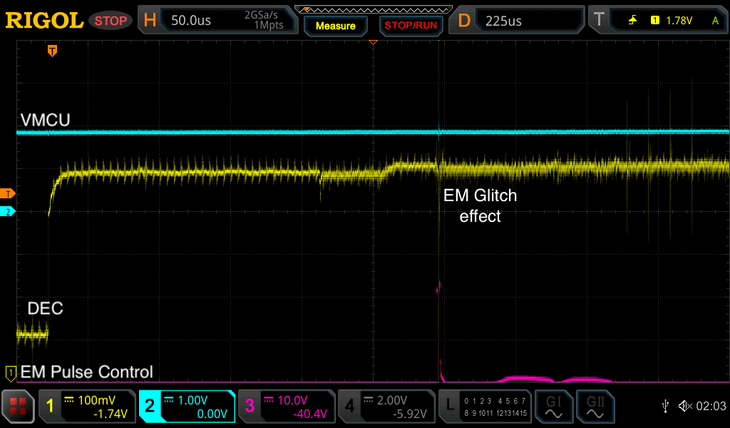 I am now targeting the previous identified 50us timing window by injecting the EM pulse at each boot-up. Here is successful EMFI attempt, leading to debug resurrection: