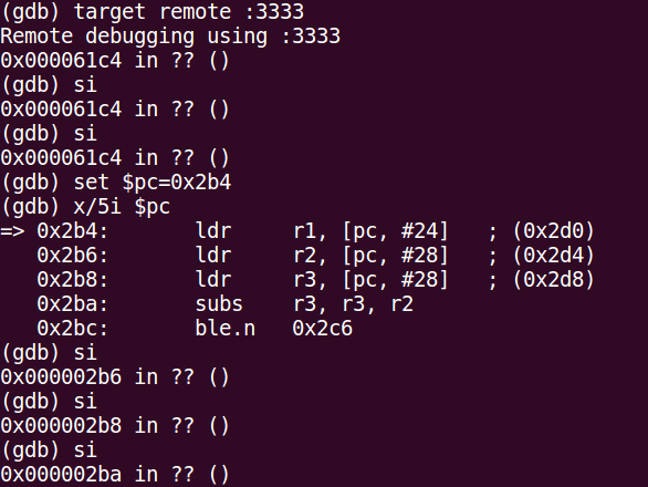 During my experiment, the CPU is stuck in endless loop at 0x61C4 after the glitch. So, the screen below shows how the Program Counter (PC) is set to execute the first instruction (at 0x2b4) then step-in into the code as Proof-of-Concept: