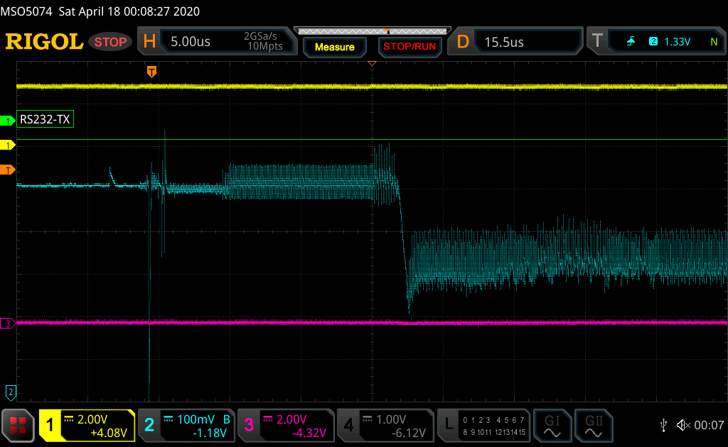 Successful glitch. CH1= UART TX, CH2 = DEC1 power consumption, CH3 = glitch command.