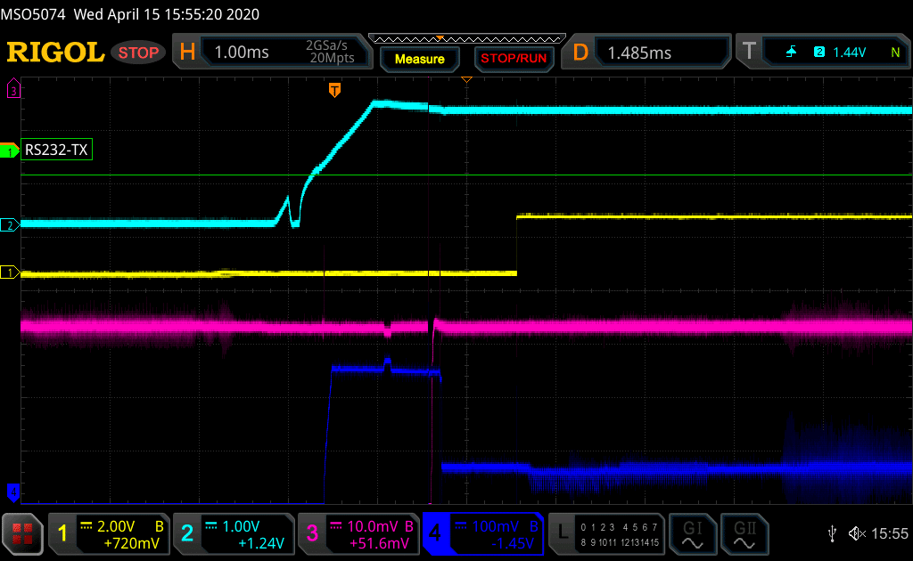 Successful attack. CH1=UART, CH2= VDD_nRF (Scope trigger), CH3 = CPU current consumption, CH4= VDD_CPU.