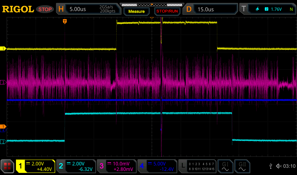 CH1 =UART, CH2 = power consumption, CH3= command, CH4=GPIO (trigger)