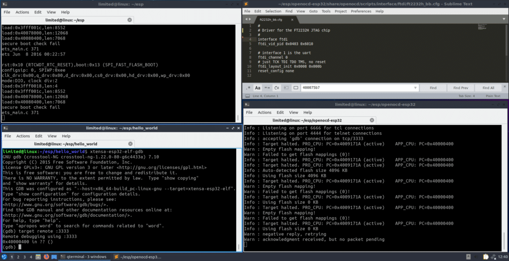 A shell for UART, a shell for GDB, a shell for openOCD and my custom config for the ft2232h breakout board