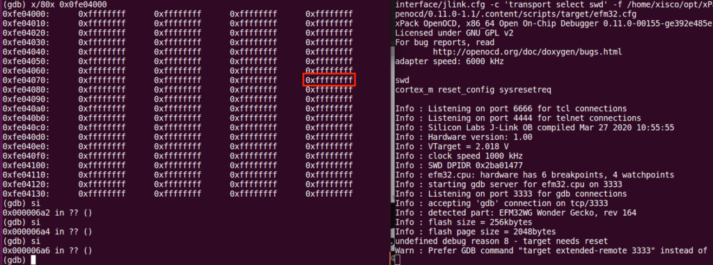 On the terminal, OpenOCD proposes to connect to the efm32 target, identifying breakpoint and watchpoints common to Cortex-M:
