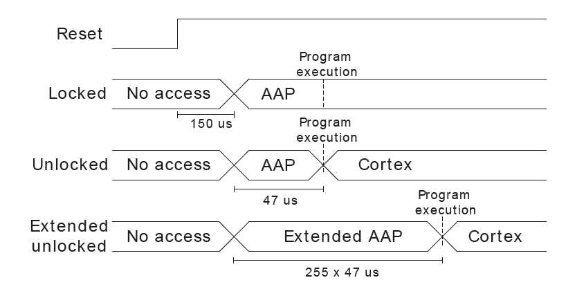 Likewise, this is matching with some information I found previously during my analysis. When an EFM32 is reset, there is a small window where a module called Authentication Access Port (AAP) is connected to the debug interface. This window is 47 µs long and occurs right before the core starts executing code.