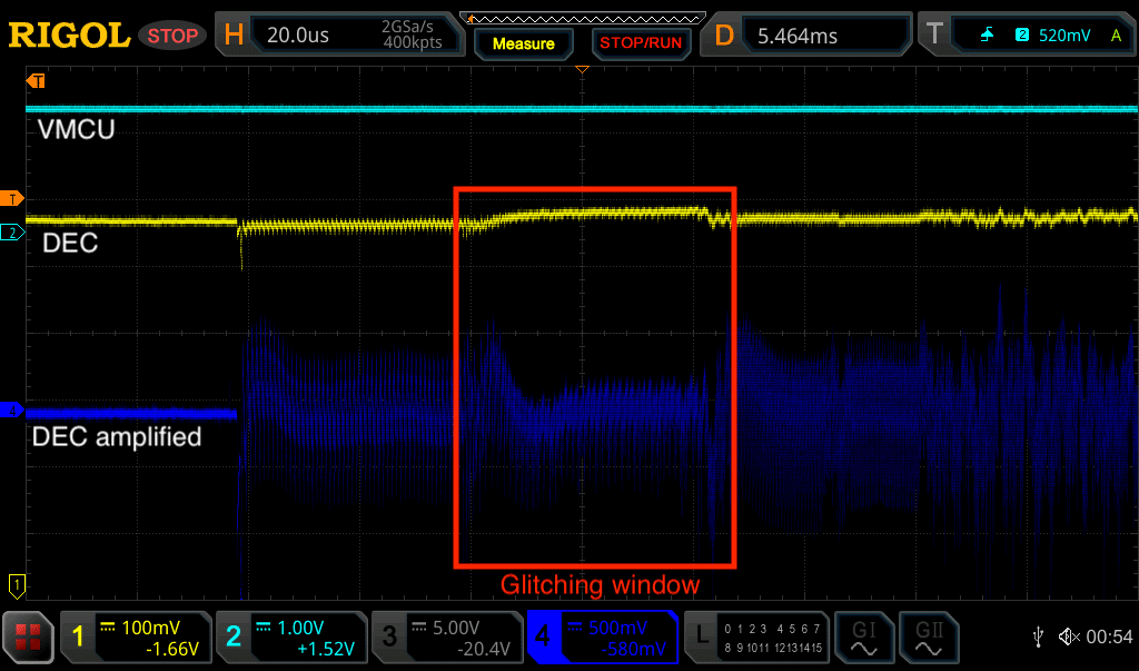 I am now targeting the previous identified 50us timing window by injecting the EM pulse at each boot-up. Here is successful EMFI attempt, leading to debug resurrection: