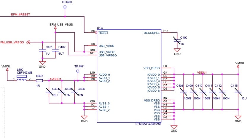 EFM32WG Schematic. The removed capacitors have been highlighted.