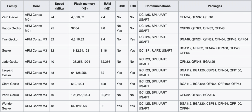 That represents a lot of devices to analyse/hack, from the EFM32 Zero Gecko based on Cortex-M0+ to the higher performing EFM32 Wonder Gecko based on Cortex-M4.