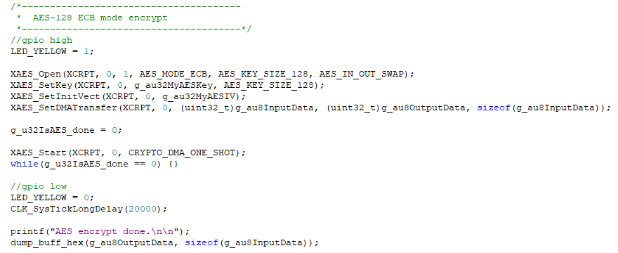AES Test Code is modified to insert GPIO functions. GPIO PA10 is set to High before the function XAES_Open() and then set to Low after XAES_Start():
