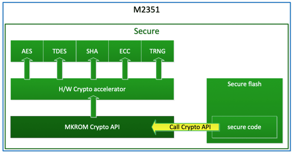 The M2351 MKROM Crypto library supports cryptographic functions which are implemented with the M2351 hardware cryptographic accelerator. The supported functions include AES, TDES, SHA, ECC and TRNG and can only be called by the secure code: