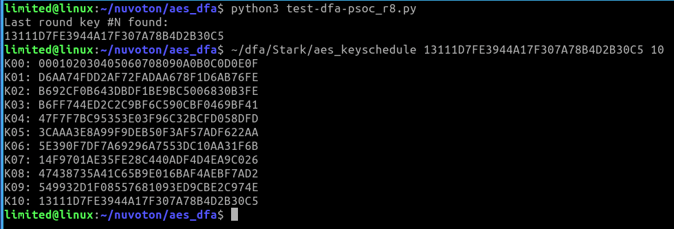 Subkey K10 recovered by DFA. Master Key recovered by reversing the aes_keyschedule