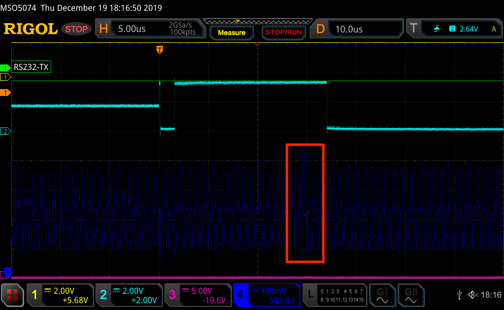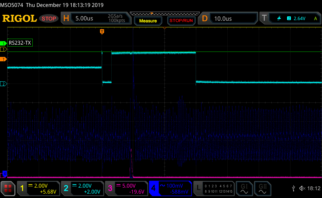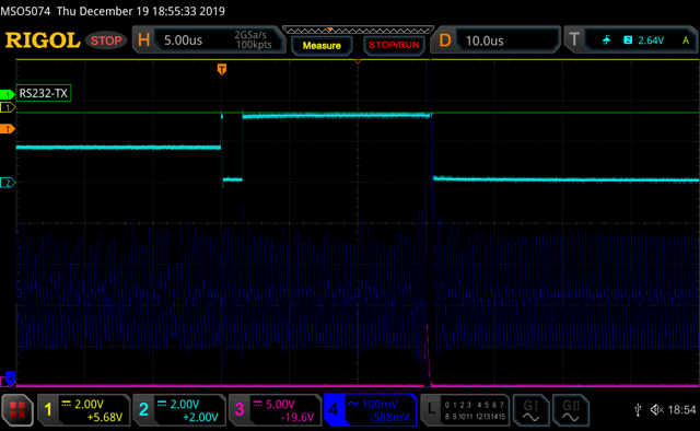 USB cable is used to power the entire board. USB to Serial Cable is used to connect the board to the PC (minicom is used as serial client 115200 8N1). LDO_CAP (pin54) is connected to the scope Channel 3 and PA10 (pin14) to the scope Channel 2.