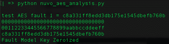 The AES Key can be zeroized using fault injection. As a result, the AES output corresponds to AES(input, key=0x00*16), which is a predictable value and can be exploited in various attack scenarios.