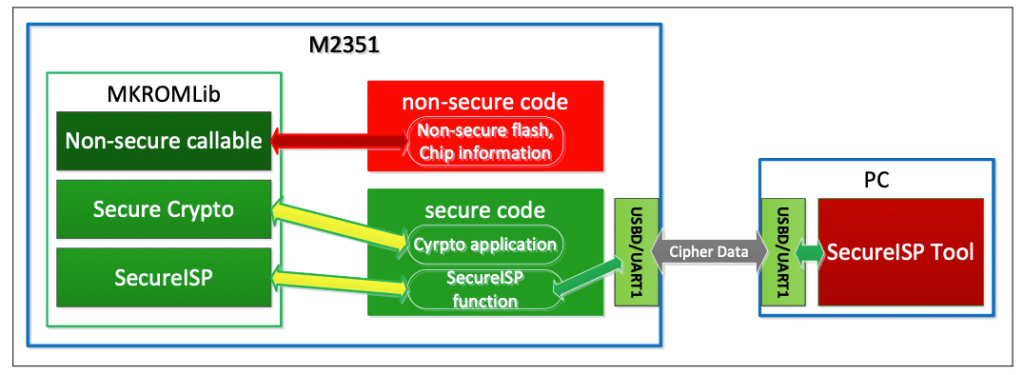 According to the application note AN2023, the MKROM Lib is a software library which is resident in M2351 Mask ROM. It provides a set of built-in functions that can be used to enable Flash, Crypto and firmware download functions by application programs.