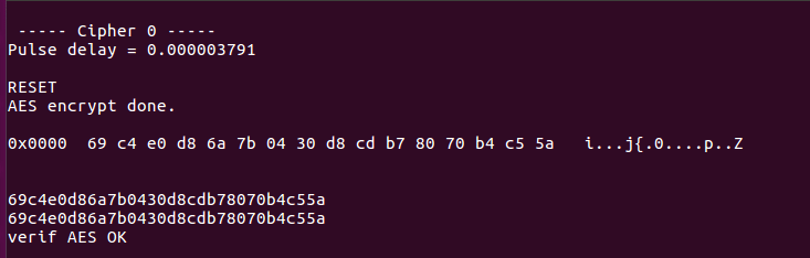 ----- Cipher 19 -----Pulse delay = 0.000003810 cipher: c8a331ff8edd3db175e1545dbefb760b ... ----- Cipher 30 -----Pulse delay = 0.000003821 cipher: c8a331ff8edd3db175e1545dbefb760b
