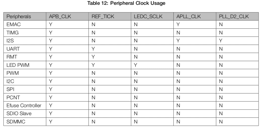 Inside the system clock diagram providing by manufacturer, tow signals are interesting, the CPU_CLK (CPU Clock) and also by the APB_CLK (Advanced Peripheral Bus Clock):