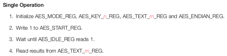 AES_MODE_REG register sets the AES mode (128 192 or 256, encryption/decryption), AES_KEY_n_REG registers store the key, AES_TEXT_m_REG registers store the plaintext message...but also the encrypted results. Interesting...