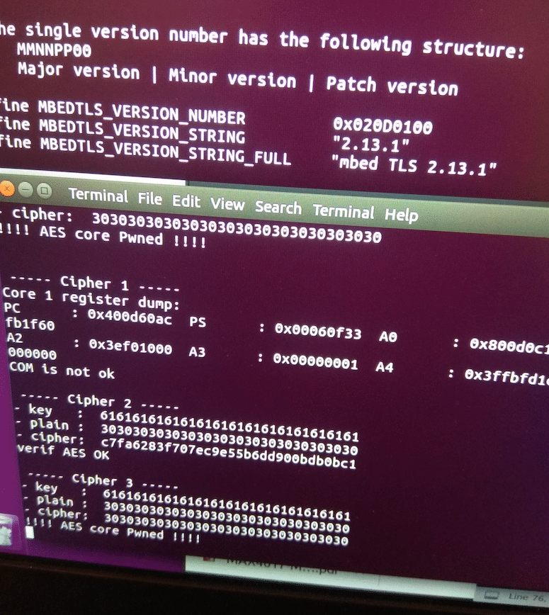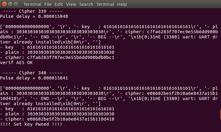 ... ----- Cipher 2 ----- key : 61616161616161616161616161616161 plain : 30303030303030303030303030303030 cipher: c7fa6283f707ec9e55b6dd900bdb0bc1 ----- Cipher 3 ----- key : 61616161616161616161616161616161 plain : 30303030303030303030303030303030 cipher: 30303030303030303030303030303030 !!!! AES core Pwned !!!!
