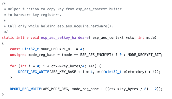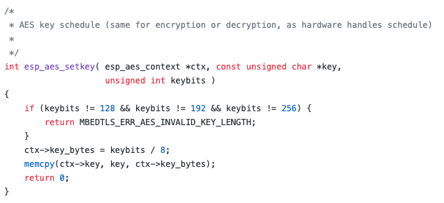 Here, I review a little bit the esp_aes_setkey() function, used by ESP hwcrypto library in esp-idf-v4.0-dev-667 but also by MbedTLS (version 2.13.1).