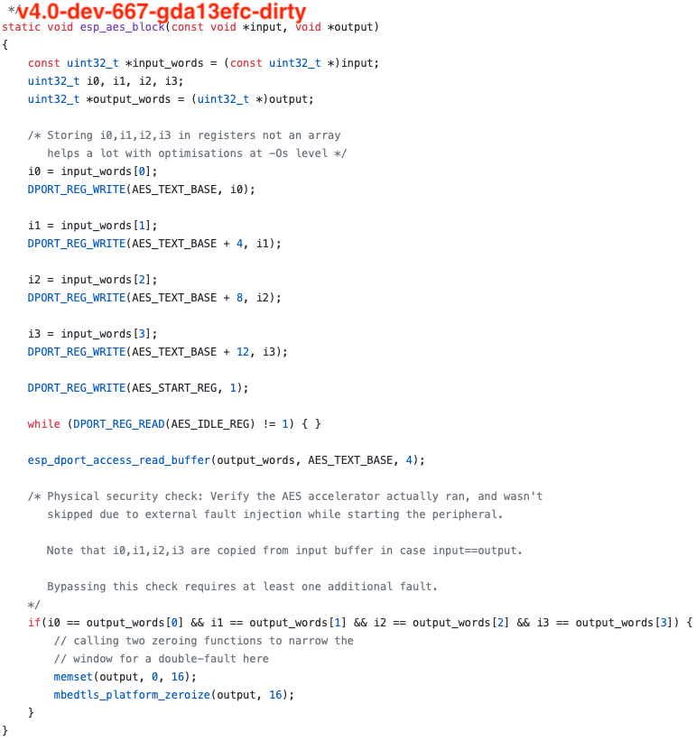 Here, I see a potential HW weakness to exploit. If I can avoid the while loop to be executed, I will skip the AES encryption. I can also try to skip the accelearator activation DPORT_REG_WRITE(AES_START_REG, 1).