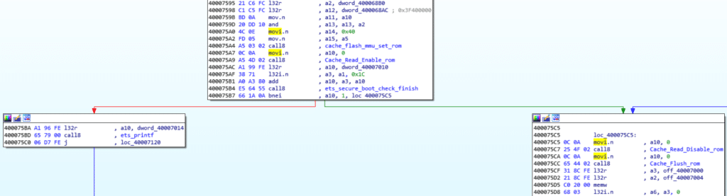 As seen above, patching the value inside the register a10 should be enough to reach 0x400075C5. Here is the GDB script example able to bypass the secure boot check, to finally execute my own image :
