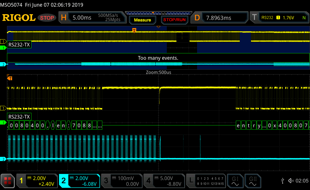 Secure boot check fail. CH1= UART TX; CH2=SPI MOSI
