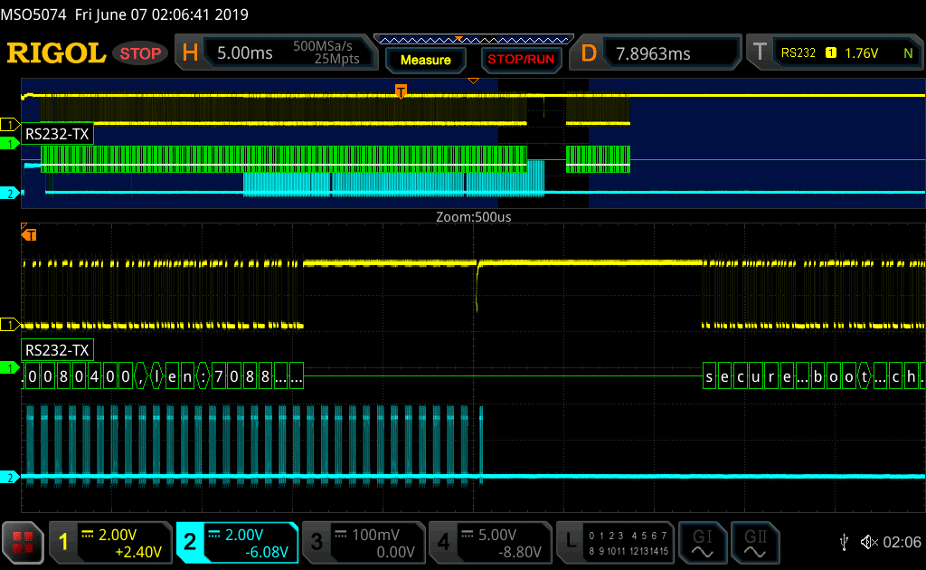 The signature verification is obviously achieved between the last SPI data frames and the UART error message 'secure boot check fail' (RS232-TX).