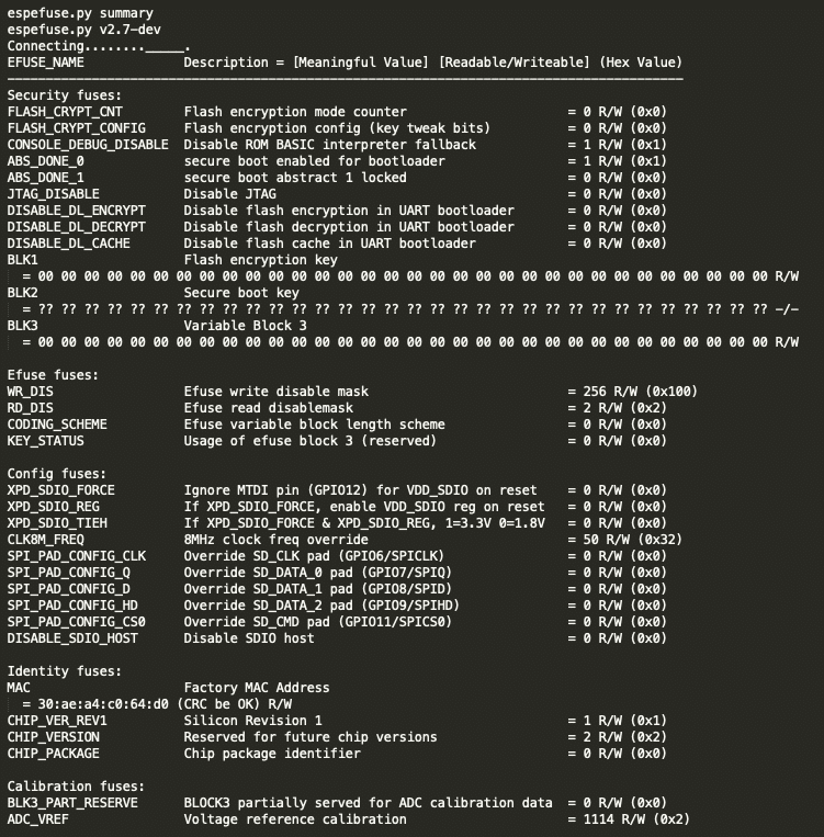 After the reset, the E-fuses map can be read using espefuse.py tool: