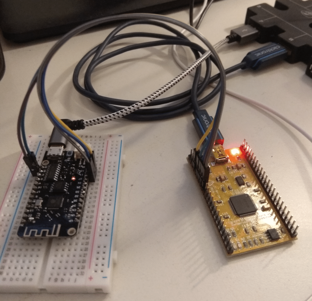 JTAG setup. ESP32 on the left, FT2232h board on the right.