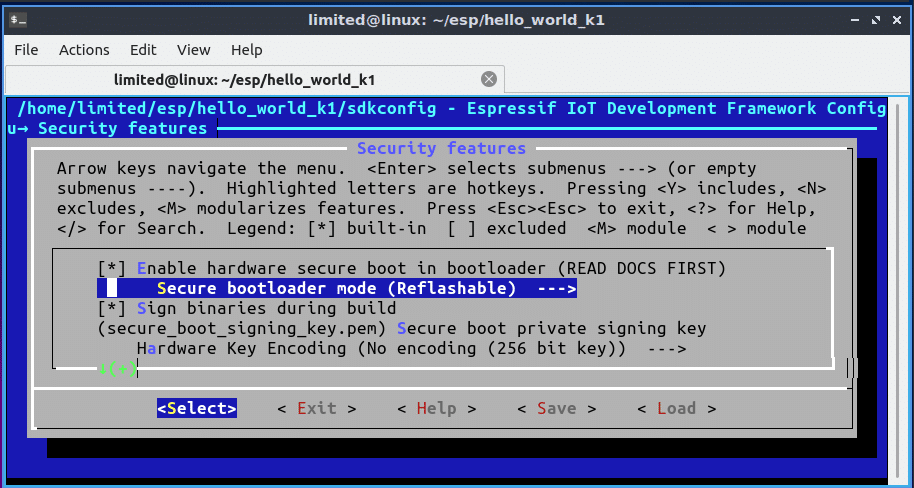 ## Burn the secure boot key into BLK2 $ espefuse.py burn_key secure_boot ./hello_world_k1/secure-bootloader-key-256.bin