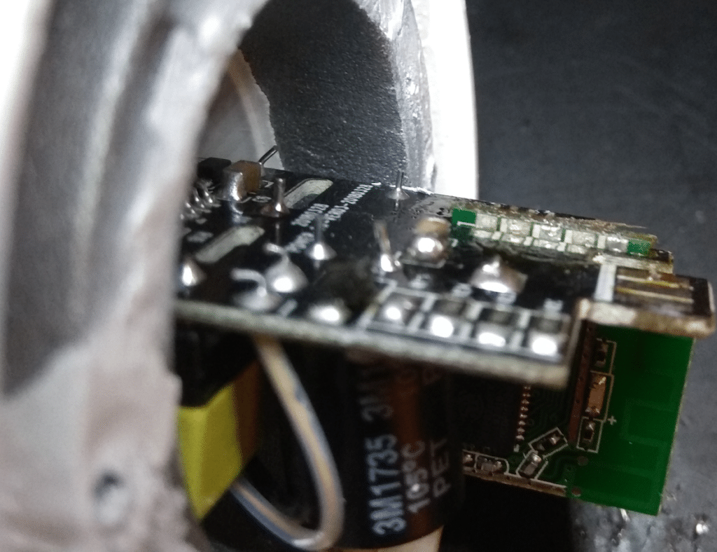 Then I unsolder the Wi-Fi Module from AC/DC converter. Interesting to see this nice 90 degrees interconnected PCBs design: