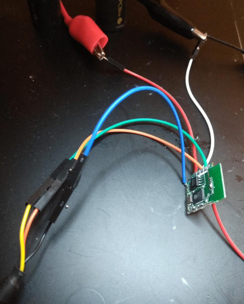 A little bit of PCB reverse is needed to retrieve the different connections of the ESP8266. Then, this ugly on-the-fly setup is achieved: